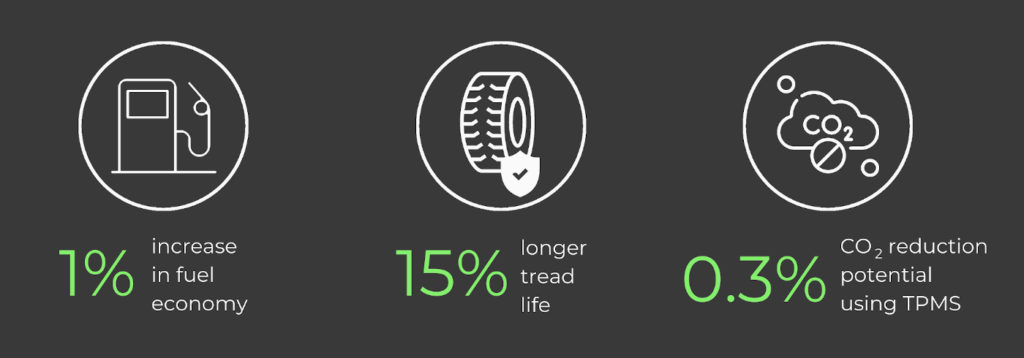 TPMS helps in maintaining extended tire lifetime by monitoring/ keeping a proper air pressure. Properly inflated, tires last longer and deliver 15% longer tread life and have 20% longer casing life.